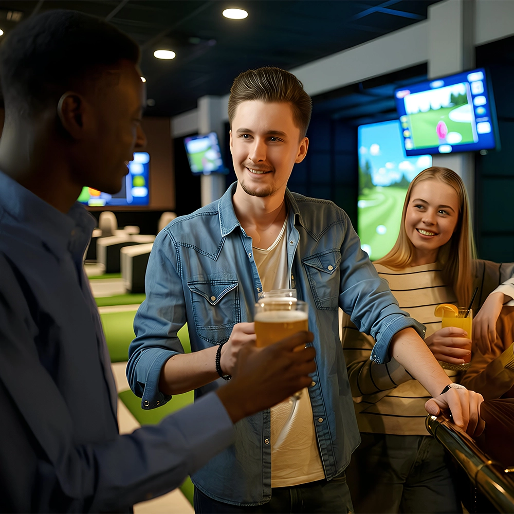 The Bar & Social at Play In Golf is the perfect place to unwind before or after your session. Enjoy draft beer, barista-style coffee, snacks, and live sport on big screens, all in a comfortable, welcoming space designed for golfers and non-golfers alike.